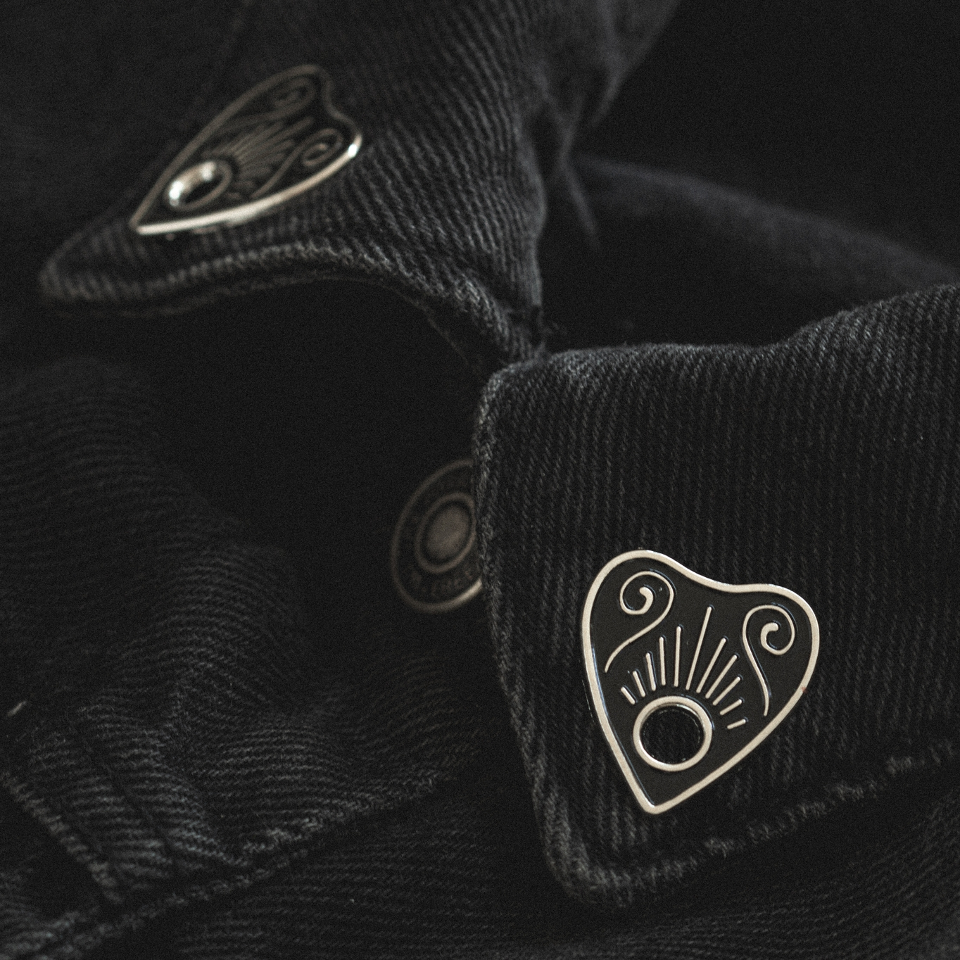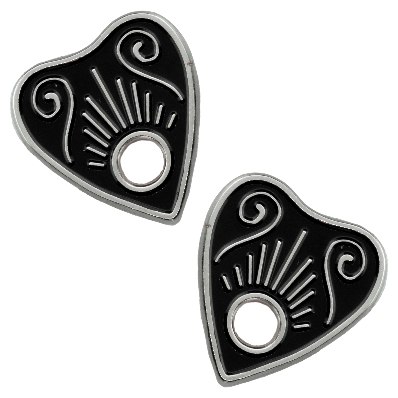 An essential accessory for ghost whisperers. This jewelry set features two elegant planchette enamel pins in silver and black. They are the perfect size to wear on your collar points. Features two clasps on the back instead of one, ensuring the pins don't spin around. Detailed and thoughtfully designed, the center hole is cut out like a real planchette.