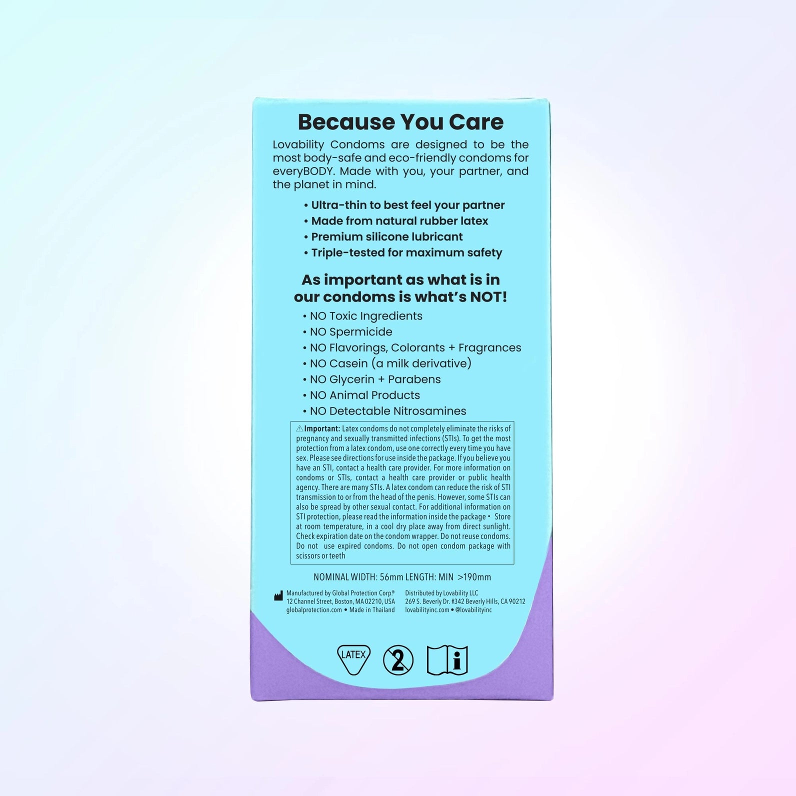 - Premium ultra-thin (0.060-0.065mm) male latex condoms. - Easy-open, recyclable “buttercup” wrappers. - Condom always right-side-up. - FDA 510(k) approved. - Electronically triple-tested for safety. - Made with 100% natural latex and smooth silicone lubrication. - Vegan (i.e., no casein). - No fragrances, dyes, gluten, parabens, spermicides, detectable nitrosamines or other harmful chemicals. - Fresh & odor-free. - Fits penis sizes M-L (7.09” / 180mm in length, 2.09”/53mm in width) - Packaging made with 100% recycled paper. Ingredients: 100% natural rubber latex (80.17%), hypo-allergenic silicone oil (18.12%), and corn starch & magnesium carbonate powder (1.71%).