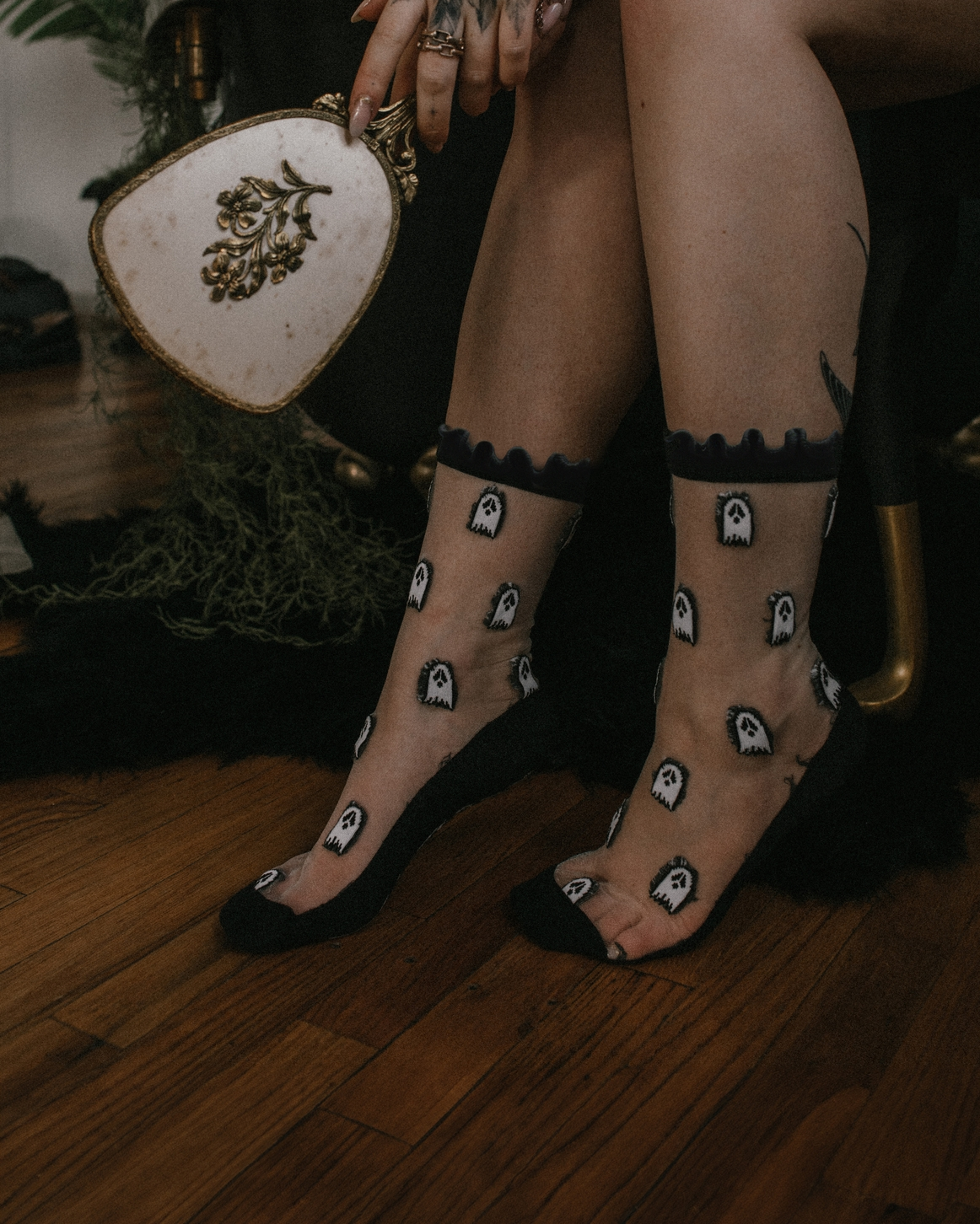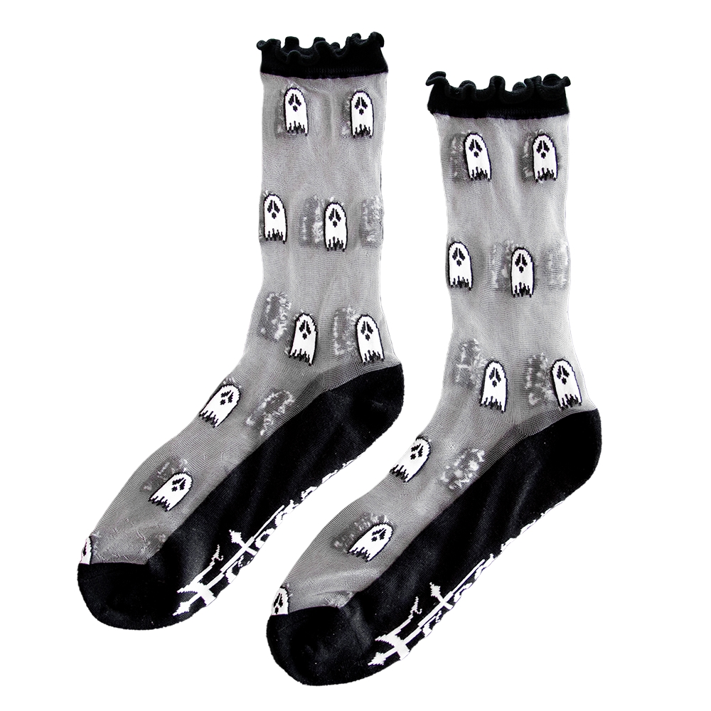 These stylish, spooky socks are transparent with cute, tiny ghosts woven all over them. They make a unique accessory for alternative fashion. Wear them with pointy flats, creepers, combat boots, and more!